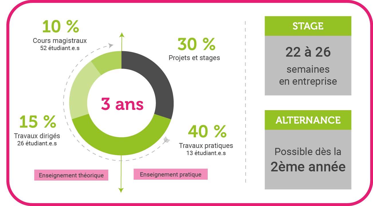 - Organisé en cours magistraux, travaux pratiques et séances de projets, il favorise un suivi précis des étudiants et l'apprentissage du travail d'équipe.